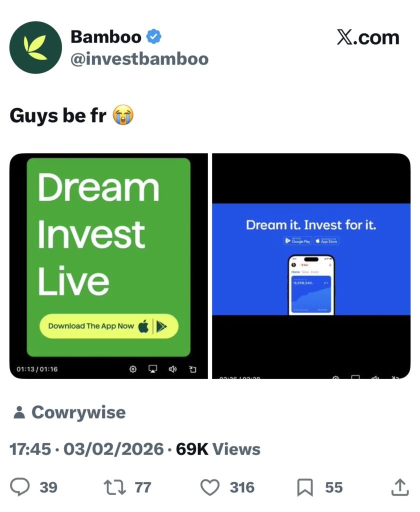 A few days ago, Bamboo called out Cowrywise for putting the “copy” in copywriting. They shared a screenshot of their ad with the line “Dream, Invest, Live“ side by side a Cowrywise ad that similarly, (but perhaps more simply) reads “Dream it. Invest for it.” with the caption “Guys be for real????” directly accusing Cowrywise of imitation.